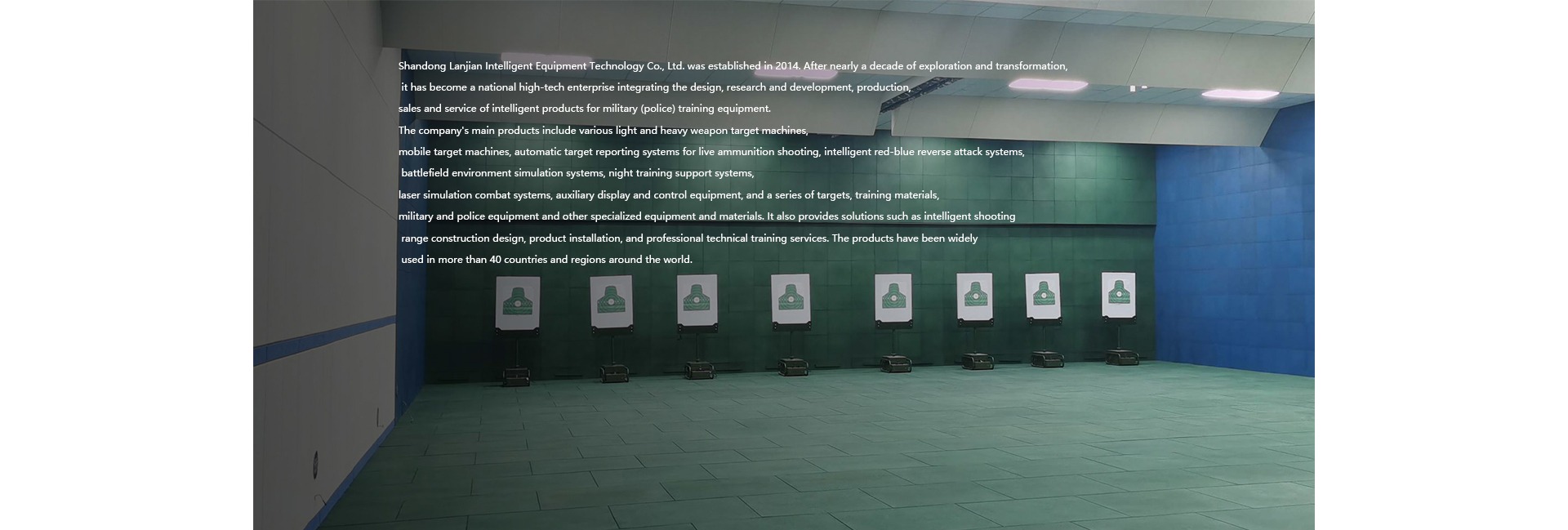Shandong Lanjian Intelligent Equipment Technology Co., Ltd. was established in 2014. After nearly a decade of exploration and transformation, it has become a national high-tech enterprise integrating the design, research and development, production, sales and service of intelligent products for military (police) training equipment. The company's main products include various light and heavy weapon target machines, mobile target machines, automatic target reporting systems for live ammunition shooting, intelligent red-blue reverse attack systems, battlefield environment simulation systems, night training support systems, laser simulation confrontation systems, auxiliary display and control equipment, and a series of targets, training materials, military and police equipment and other specialized equipment and materials. It also provides solutions such as intelligent shooting range construction design, product installation, and professional technical training services. The products have been widely used in the realistic training of over 30 international forces around the world, effectively supporting the national defense equipment construction of various countries.
